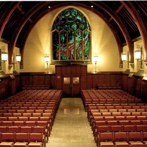Eustis Chair manufactures funeral home chairs. The funeral homes we work with prefer stacking wood chairs. Not only because our stacking funeral home chairs come with a 20- year warranty. Also, because they are easy to move and store when not in use. This makes it easy to clean the space between wakes or visitations. We find many funeral homes are moving away from heavy immobile pews and replacing them with hardwood chairs. The change results in a more updated space with comfortable chairs when people need comfort the most. Let’s take a look back at three of our recent funeral home projects.